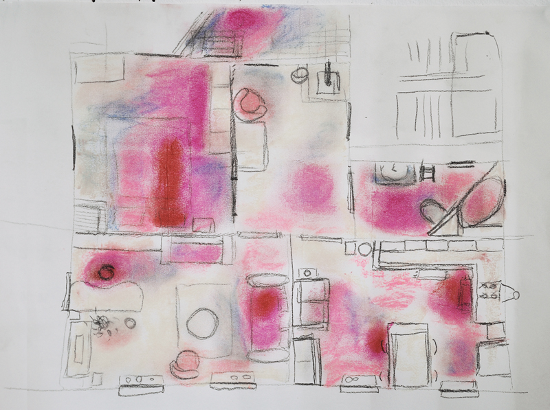 1. Im ersten Teil des Seminars werden die Grundrisse der privaten Räume aller SeminarteilnehmerInnen gezeichnet. Die farbigen Valeurs und Markierungen in den Grundrissen unterscheiden individuell die Bereiche in den Wohnungen, die stark, mittel oder wenig benutzt sind. Eine kartografische Zeichnung repräsentiert das individuelle Erleben eines konkreten Raumes.