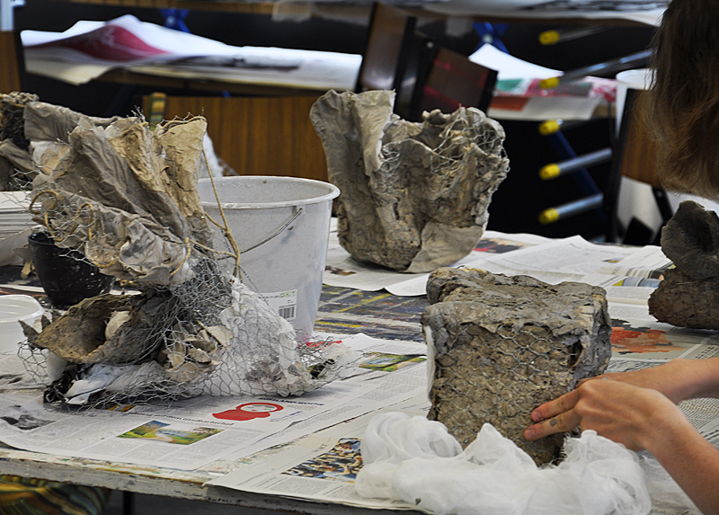 4. Im vierten Teil wird Material in einer Mischung aus Drahtgeflecht, Holz, Pappmache und Gips frei experimentell angewandt und geformt. Der sperrige Eigensinn des Materials konkurriert mit der Formidee und der Konstruktion von Raum. Sich dem Eigensinn des Materials zu überlassen ist die eine Seite und eine Formidee durchzusetzten die andere. Zwischen diese beiden Polen pendelt der Prozess, der in seinen Ergebnissen ablesbar ist. Die Lebendigkeit der Oberflächen schafft eine mit Sinnesempfindung aufgeladene emotionale Qualität.